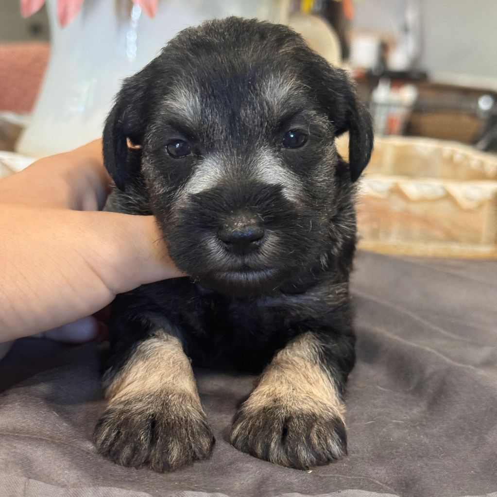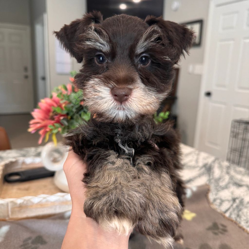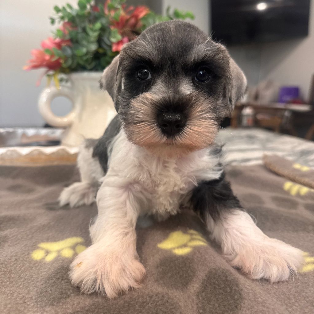 Hi! I’m Lily. I am a salt & pepper female. I have a docked tail. I always have a devious schnauzer look on my face but it really just means I want to come lay on your lap and chew on my teething toy. I love pets.